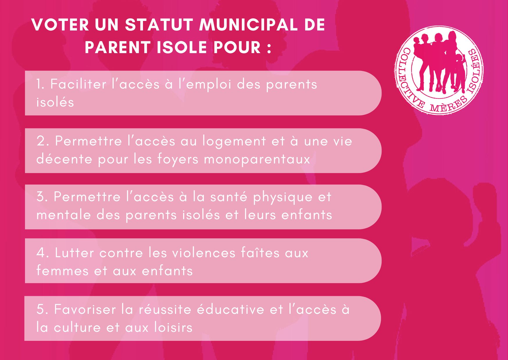 Posons ce chiffre sans appel, seulement 0.25% du budget national est alloué aux questions d’égalité femme homme. La France remporte la 26ème place du classement sur 30 pays concernant l’aide apportée aux femmes. En conséquence de l’absence d’engagement, voire du désengagement croissant des pouvoirs publics vis-à-vis des populations précaires, les mères isolées cumulent à elles seules tous les défis : travail, justice, logement, santé. La création d’un statut municipal de parent isolé doit leur ouvrir l’accès à l’échelle locale à un ensemble de droits afférents en matière de logement, santé, travail, culture et loisir selon les 5 priorités établies ci-après.